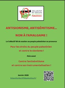 Le Collectif 69 de soutien au peuple Palestinien est une association loi 1901 qui s’est donné pour vocation de promouvoir et de mettre en œuvre toutes les actions qui, maintenant et dans l’avenir, aideront à l’application et au respect des droits fondamentaux du peuple palestinien, sur la base de la légalité internationale, et de dénoncer toutes les atteintes aux Droits Humains, conformément à la Déclaration Universelle des Droits de l’Homme, aux Conventions de Genève et à la Charte des Nations Unies.