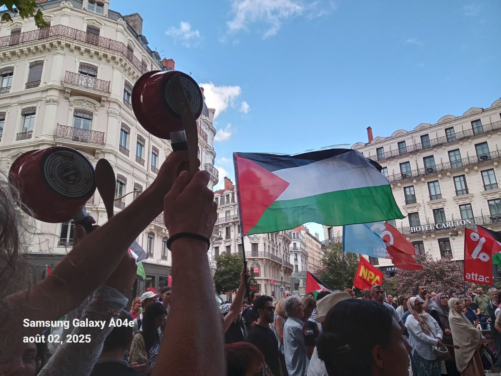 Comme dans de nombreuses villes du monde, les lyonnais se sont réunis pour une « casserolade », ils étaient 600 ce samedi 02,08.2025,en plein centre ville. Révulsés par le génocide et la famine intentionnelle, beaucoup avaient confectionné des panneaux pour clamer leur protestation, Les slogans étaient ponctués par le bruit des casseroles vides « Gaza, Gaza, Lyon est avec toi ! « Ce n’est pas une guerre c’est un génocide ! » De nombreuses discussions ont eu lieu devant les stand et autour des 800 tracts distribués .Le collectif 69 Palestine, l’AFPS, l’UJFP, le groupe BDS et Europalestine sont intervenus, ainsi que deux avocat.e.s lyonnais.es qui ont fait le point sur la procédure judiciaire engagée par 114 avocats contre le gouvernement français auprès de la Cour Pénale Internationale pour « Complicité de génocide à Gaza » !