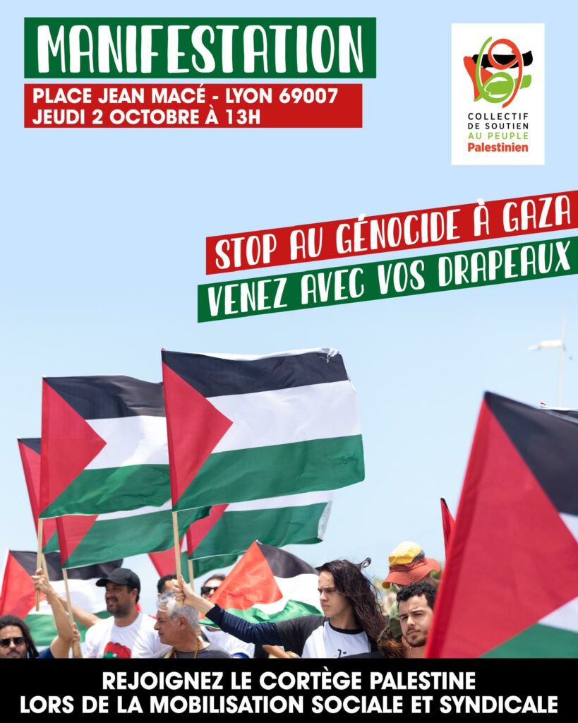 Jeudi 2 octobre 2025 Participons au cortège : « STOP AU GÉNOCIDE A GAZA » dans la manifestation unitaire à LYON