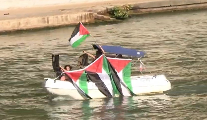 Des bateaux ornés de drapeaux palestiniens rendaient hommage à la grande flottille pour briser le blocus de Gaza qui vogue en ce moment pour les rives palestiniennes ! Le collectif des avocats pour la justice au Moyen-Orient était présent et ont pris la parole au départ de la manifestation, ainsi que l’association « Taxis contre le génocide » et « les soignants contre le génocide.