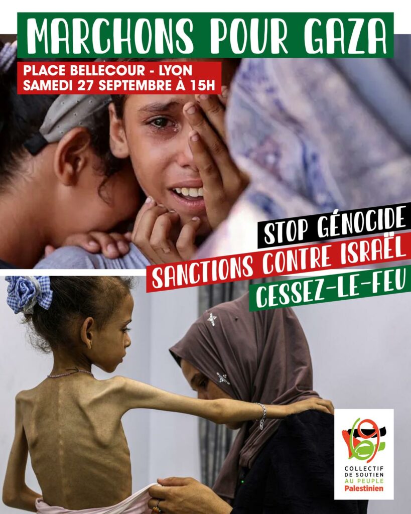 Samedi 27 septembre 2025, 15 h Marchons pour dire « STOP au génocide de Gaza et OUI aux sanctions contre Israël » Départ place Bellecour LYON