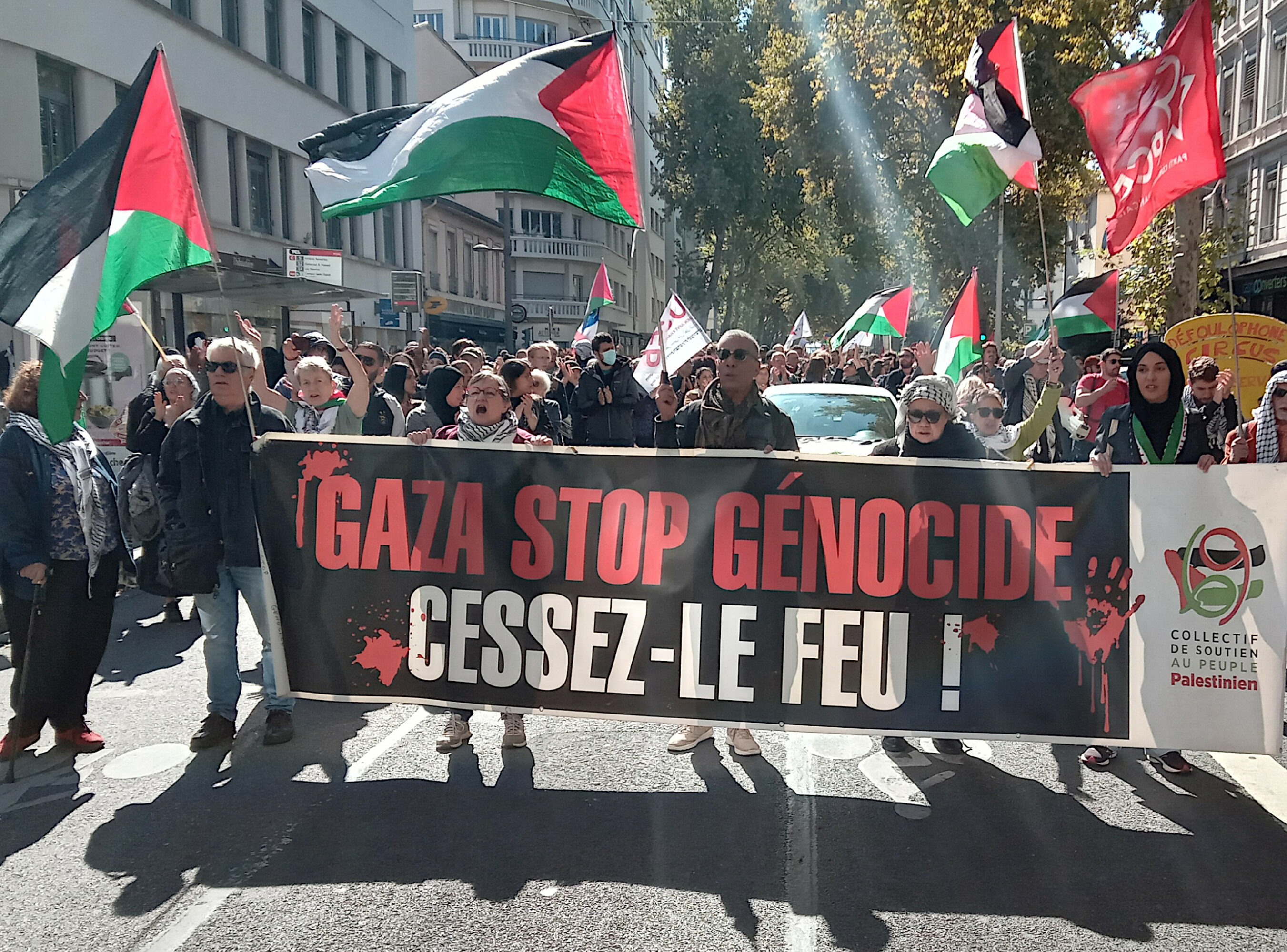 Dans la grande manifestation de l’intersyndicale ce jeudi 2 octobre 2025 à Lyon, nous avons formé un cortège Palestine pour dire STOP au génocide et soutenir la global sumud flotilla attaquée par les pirates israéliens « Libérez la flottille, libérez la Palestine » fut le slogan du jour ! Près de 500 solidaires étaient présents … on ne lâche rien !