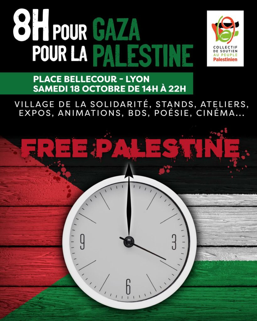 Le Collectif 69 de soutien au peuple Palestinien est une association loi 1901 qui s’est donné pour vocation de promouvoir et de mettre en œuvre toutes les actions qui, maintenant et dans l’avenir, aideront à l’application et au respect des droits fondamentaux du peuple palestinien, sur la base de la légalité internationale, et de dénoncer toutes les atteintes aux Droits Humains, conformément à la Déclaration Universelle des Droits de l’Homme, aux Conventions de Genève et à la Charte des Nations Unies.