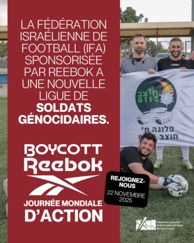 Reebok sait qu’il est du mauvais côté de l’histoire. Fin septembre, Reebok a en effet demandé que son logo soit retiré de l’IFA. Reebok a immédiatement cédé à la pression d’Israël, revenant sur sa décision et déclarant qu’il continuait à sponsoriser « fièrement » l’IFA malgré sa complicité avérée dans les crimes israéliens contre les Palestinien·nes.