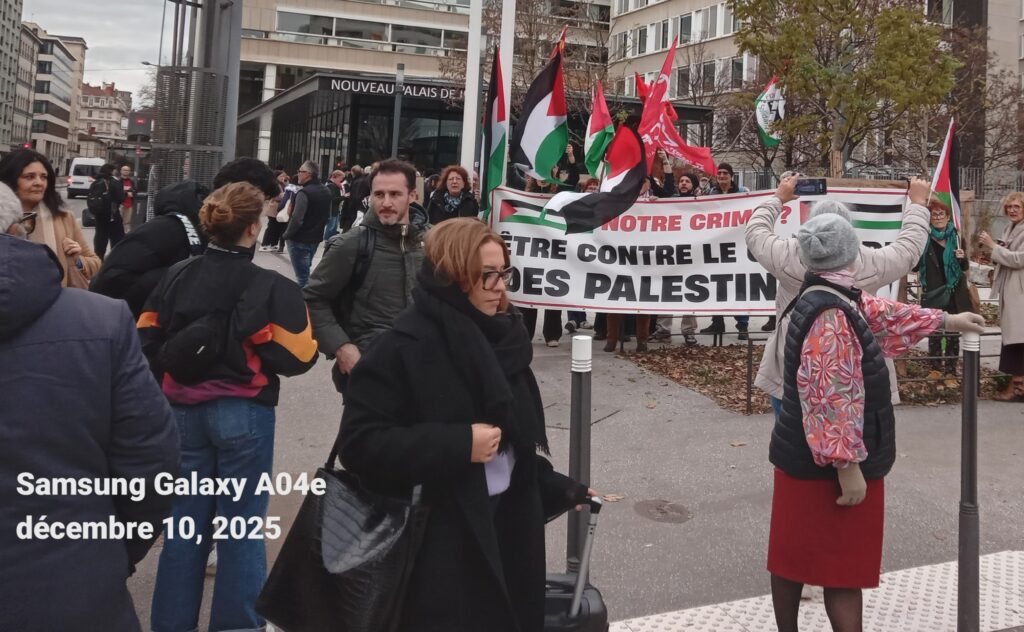 Rassemblement devant le tribunal de Lyon pour soutenir Yamin accusé injustement d’apologie du terrorisme. Plusieurs dizaines de militant.e.s étaient présents pour dire « Gaza, on ne se taiera pas ! Défendre la Palestine n’est pas un crime !