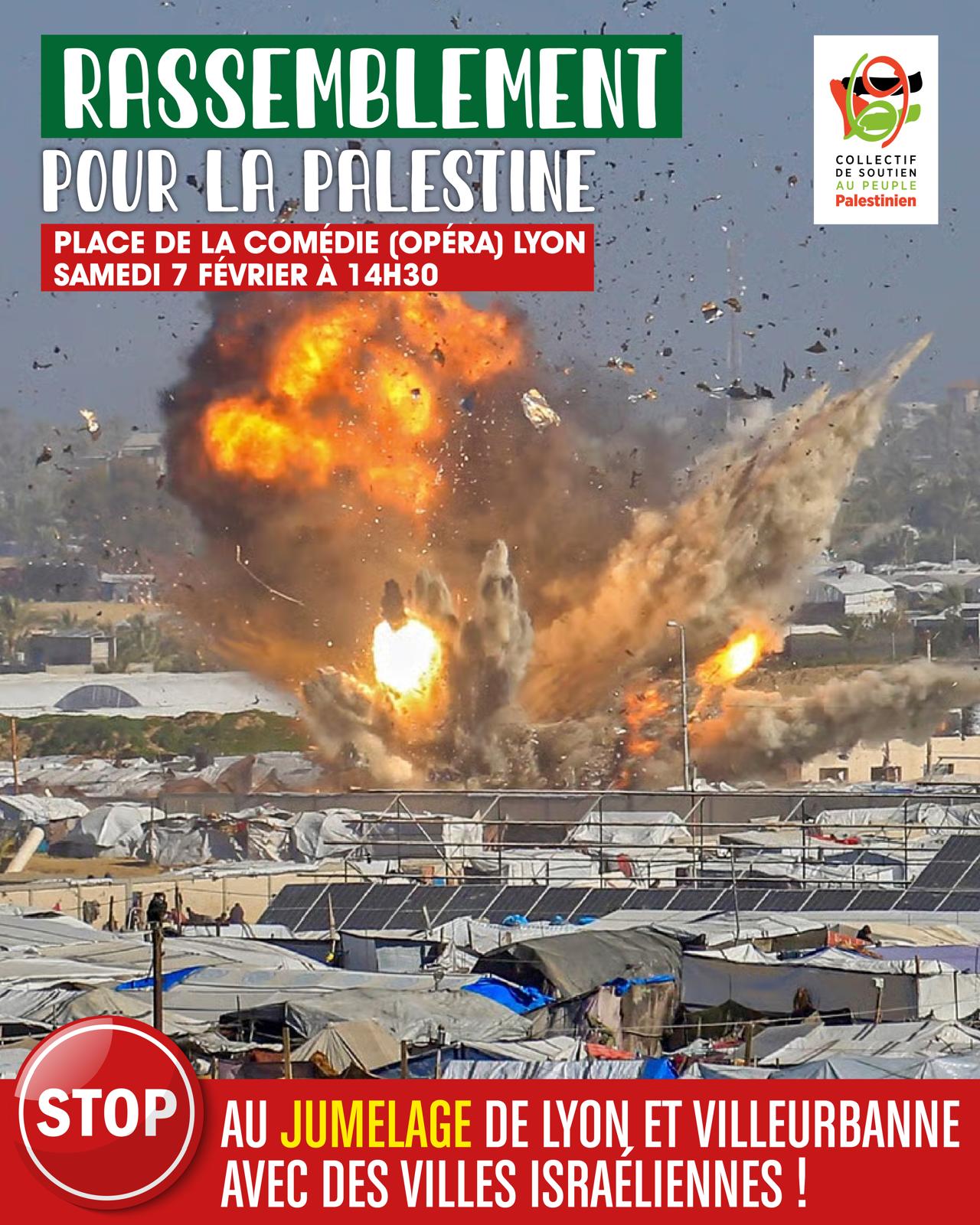 Rassemblement pour la PALESTINE le 7 février 2026 à Lyon 1er place de la comédie : STOP au jumelage de Lyon et Villeurbanne avec des villes istaéliennes