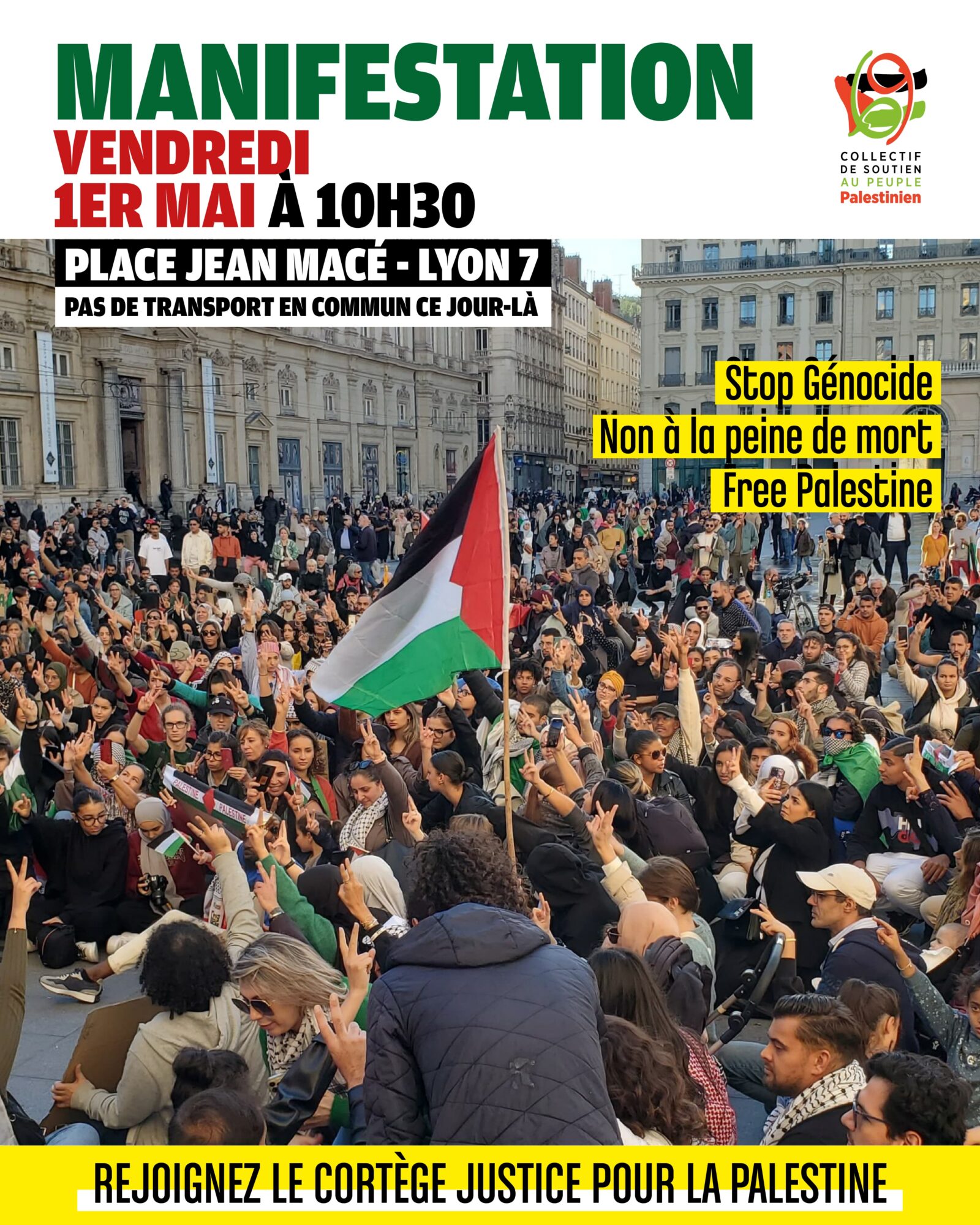 Vendredi 1er mai 2026 10h30 Cortège « Palestine » dans la manifestation unitaire du 1er mai, Journée internationale des travailleurs. LYON 7° Place Jean Macé