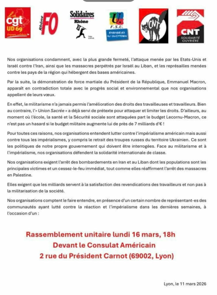 • Lundi 16 mars 2026 -à 18h Rassemblement unitaire contre l’attaque menée par Israël et les U.S.A2 rue du Président Carnot organisé par l’intersyndicale du Rhône