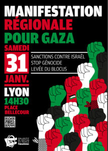 mercredi 4 février 2026 18h30 Réunion mensuelle (réunion ouverte à toutes et tous) Bourse du travail 1er étage place Guichard Lyon 3ème Samedi 7 février 2026 Rassemblement : « non au jumelage de Lyon et Villeurbanne avec des villes istaéliennes place de la Comédie (devant l’opéra de Lyon —————————————————- 20,21,22 février 2026 Stand du collectif au […]